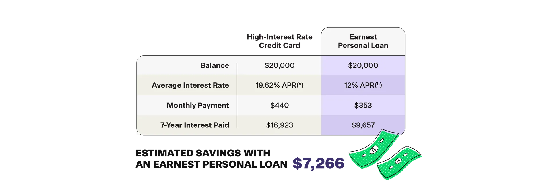 (b) Example chart shows calculations based on a 7-year Earnest Personal Loan with a fixed rate of 12% APR, which represents the mid-range of Earnest Personal Loan rates. Actual rates range from 7.99% to 24.99% APR with Auto Pay discount; lowest rates are reserved for the most qualified borrowers. The rate shown does not include the 0.25% Auto Pay discount. The 'High-Interest Rate Credit Card' APR of 19.62% is the average credit card interest rate as reported in Q1 2026. The savings estimate assumes the borrower applies the same payment behavior to the credit card balance as to the personal loan by making fixed, on-time monthly payments sufficient to repay the balance over 84 months. It also assumes the borrower does not take on any additional credit card debt during this period. Both calculations are based on 84 total monthly payments (7 years), with no origination fee and no prepayments.