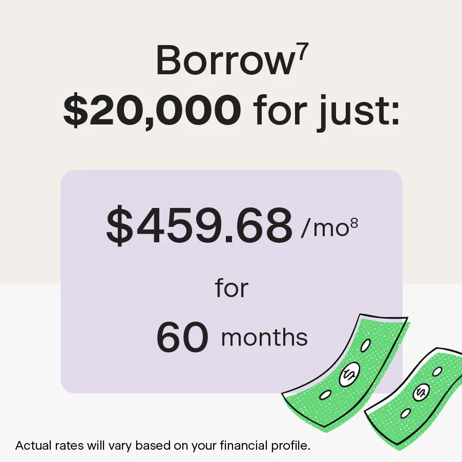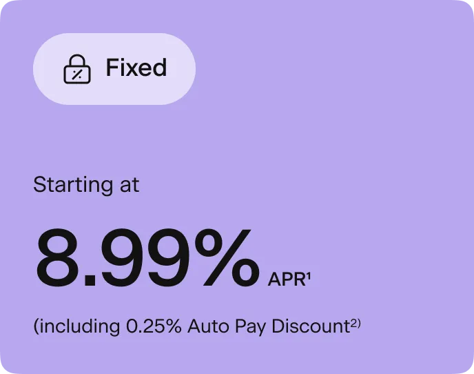 1 Actual rates will vary based on your financial profile. Fixed Annual Percentage Rates (APR) range from 9.24% to 25.24% (8.99% - 24.99% with a 0.25% Auto Pay discount and optional origination fee). The lowest rates are available to the most creditworthy applicants and require selecting the shortest loan term, enrolling in Auto Pay, and opting in to the origination fee. Auto Pay enrollment is not required to obtain a loan.